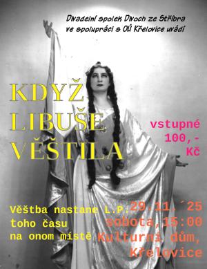 Divadelní spolek Divoch ze Stříbra ve spolupráci s OÚ Křelovice srdečně zvou na divadelní představení, které se uskuteční v sobotu 29.11.2025 od 15 hod. v kulturním domě Křelovice