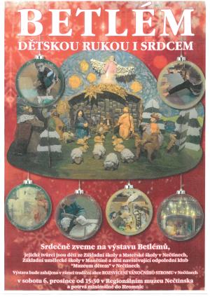 Srdečně zveme na výstavu Betlémů, kterou vytvořily děti ze Základní školy a Mateřské školy v Nečtinech, Základní umělecké školy v Manětíně a děti navštěvujíc odpolední klub „Muzeum dětem“ v Nečtinech. Výstava bude zahájena v rámci tradiční akce Rozsvícení vánočního stromu v Nečtinech.